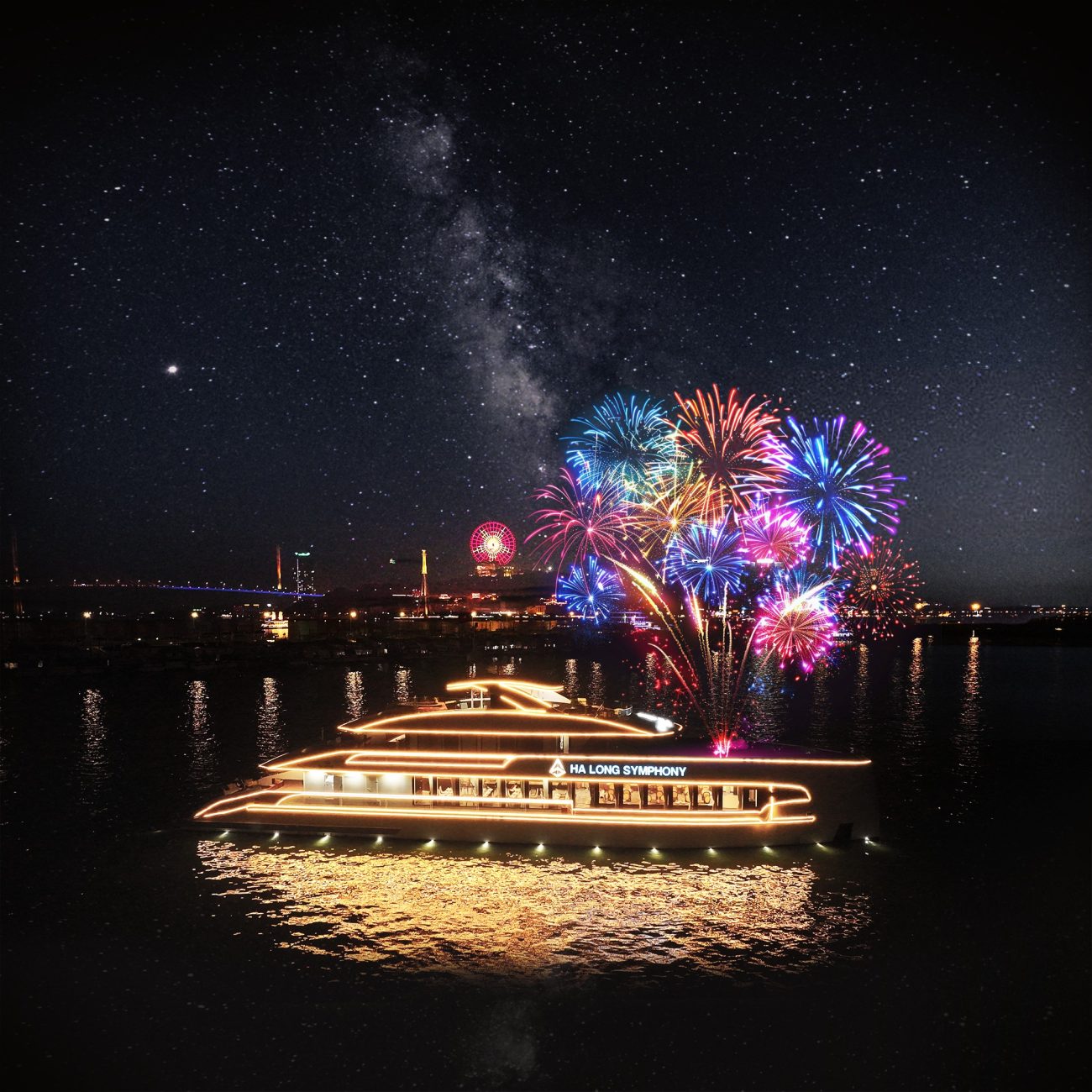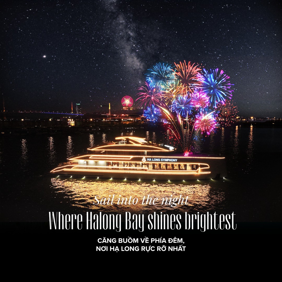 Moments when the brilliance of fireworks blends with the saltiness of the sea, the rhythm of lively music, and the aroma of exquisite cuisine carried by the ocean breeze—coming together to create an unforgettable night aboard the Halong Symphony.